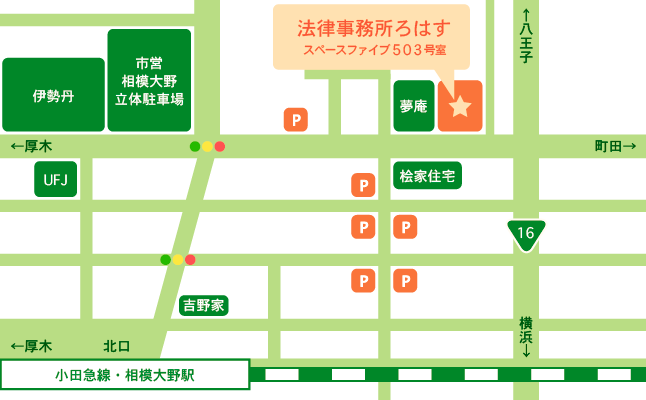 国道16号線の谷口陸橋下交差点を(八王子方面からは)右折/(横浜方面からは)左折し、相模大野駅方面に進むとすぐ右手に見えるコンクリート壁7階建ての建物に当事務所が入っております。正面向かいには桧家住宅の建物があります。